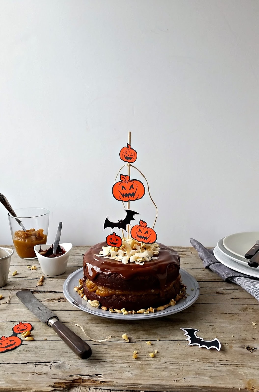 Para montar o bolo, colocar um dos discos no prato de servir, distribuir uma boa camada de caramelo de tâmaras e abóbora por cima, espalhar as nozes e o pinhão por cima e colocar o segundo disco. Distribuir a cobertura de chocolate por cima e decorar com lascas de côco.