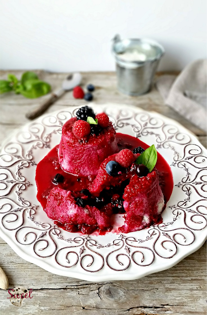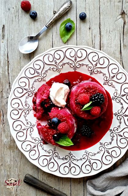 Desenformar com cuidado, retirar a película aderente e colocar nos pratos de servir. Verter por cima o restante sumo dos frutos, decorar com frutos vermelhos a gosto e servir fresco acompanhado com creme fraiche.